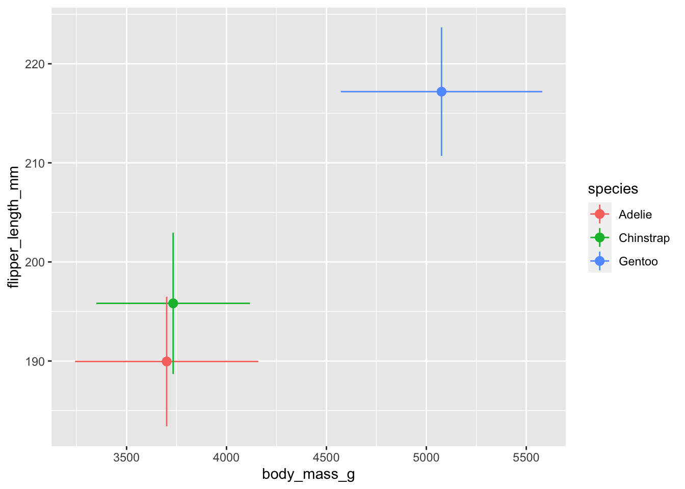 Q16: geom_pointrange() is like geom_point() with the addition of error bars. Like geom_point(), geom_pointrange() takes x and y aesthetics, but it also takes xmin, xmax, ymin and ymax aesthetics. Create a figure that shows the mean \(\pm\) sd of each penguin species’ body mass and flipper lengths using points and error bars; it should look like the figure below. First, create a summary data frame that calculates the mean and standard deviation of the two variables you need by each species. Then use that summary data frame to create your figure. Hint: geom_pointrange() takes xmin or xmax, same for ymin or ymax. So you’ll need to call geom_pointrange() twice and specify the aesthetics within the geometry.
